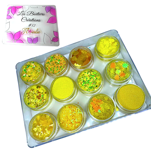 Ce boitier contient 12 couleurs de paillettes différentes.