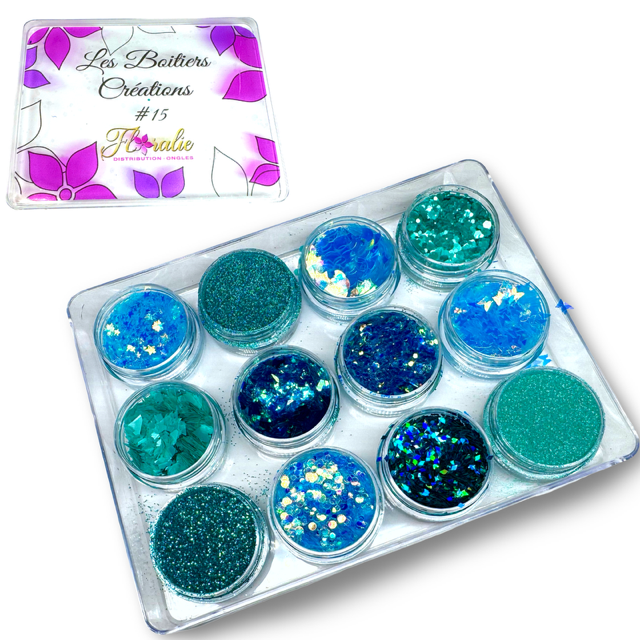 Boitiers créations Floralie Ce boitier contient 12 couleurs de paillettes différentes.