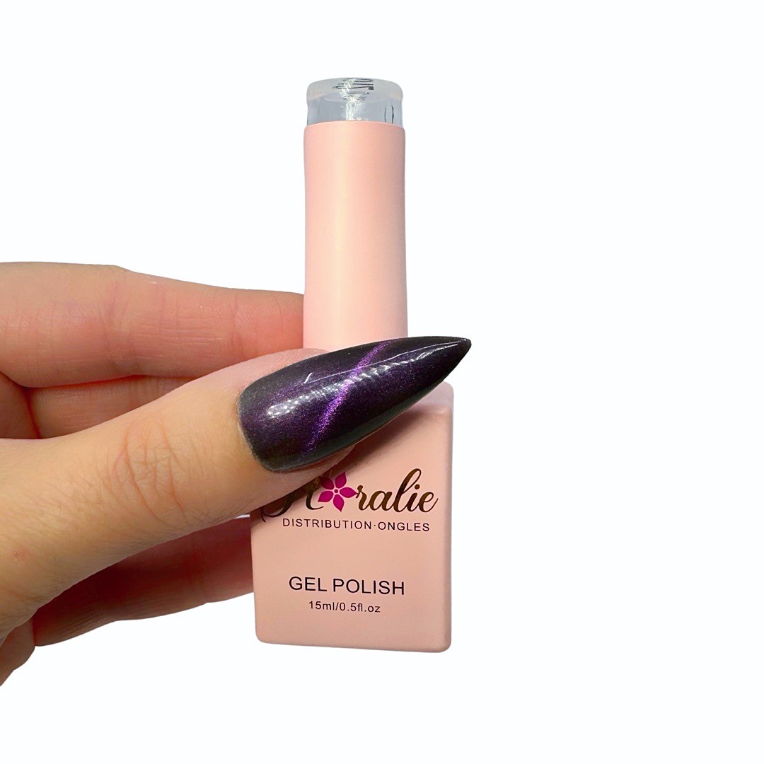 Vernis gel #117 ( Cat eyes) Sur cette photo nous avons mit un fond blanc pour donner plus d’opacité.